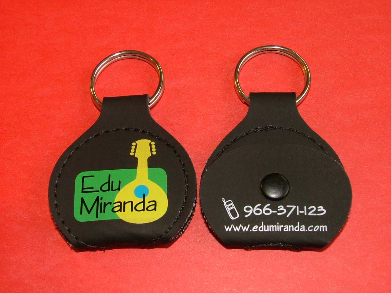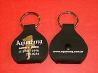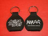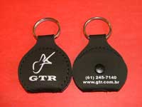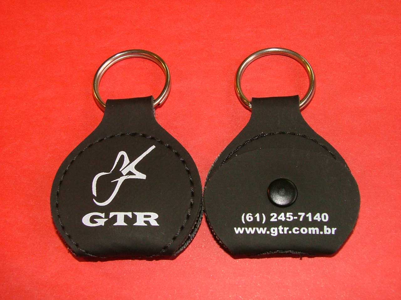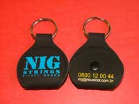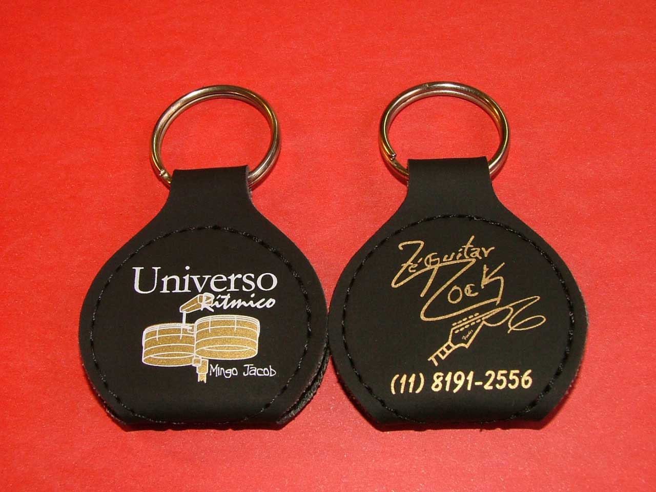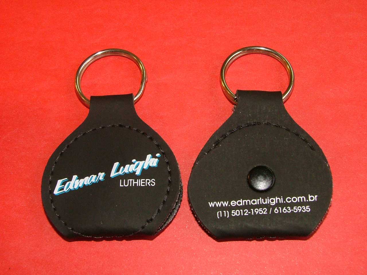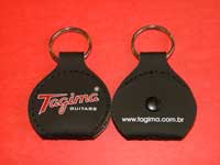 O chaveiro porta-palhetas é confeccionado em couro sintético nas cores preto, tabaco e vermelho. Pedido mínimo: 100 unidades