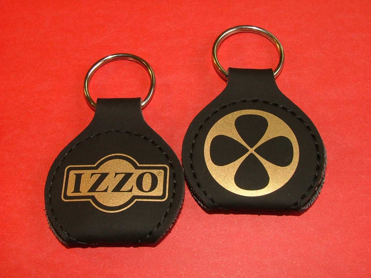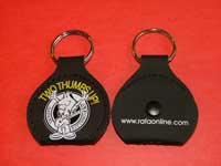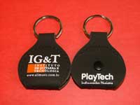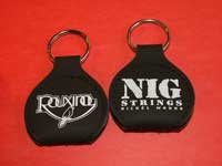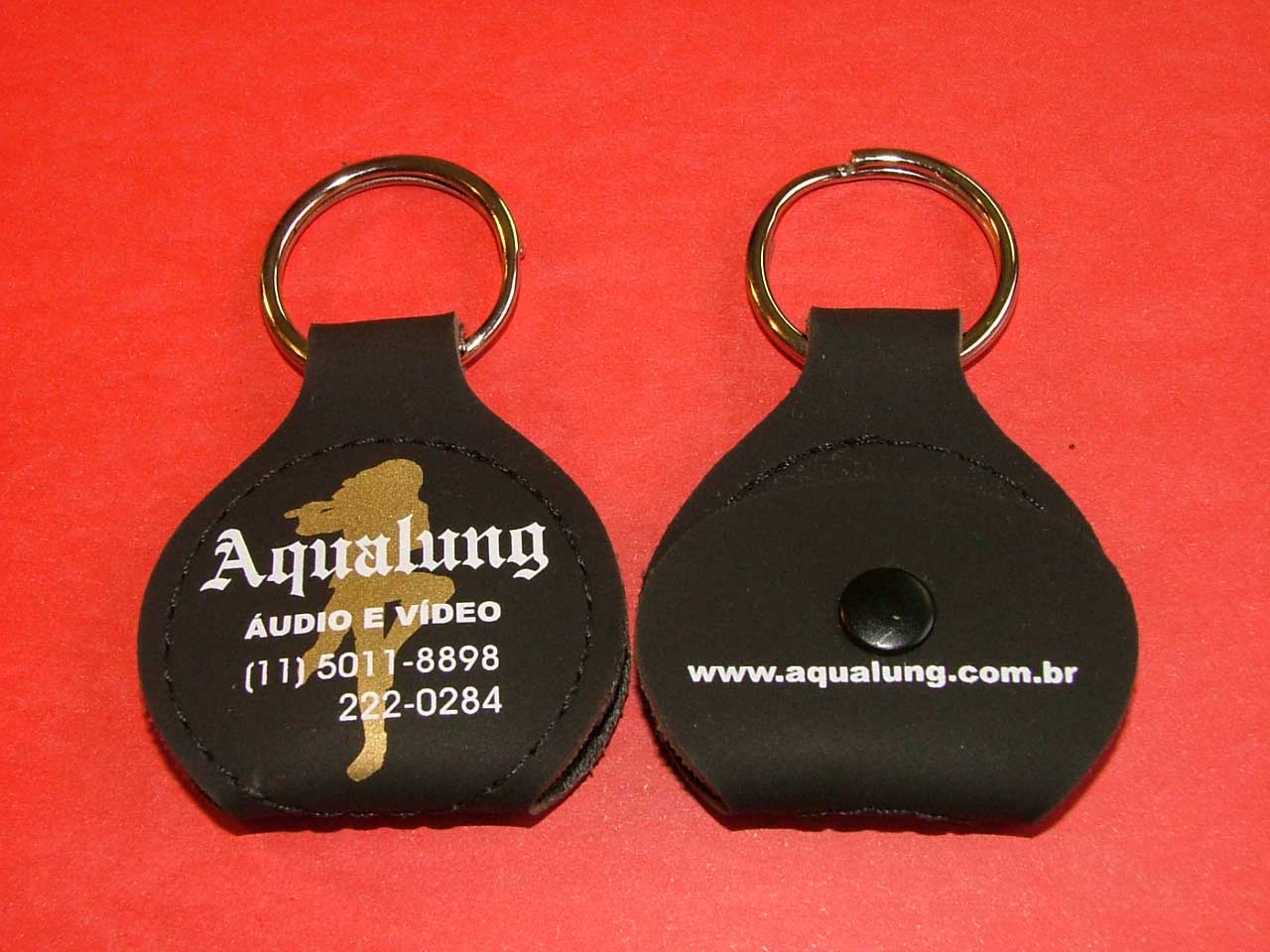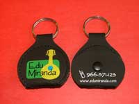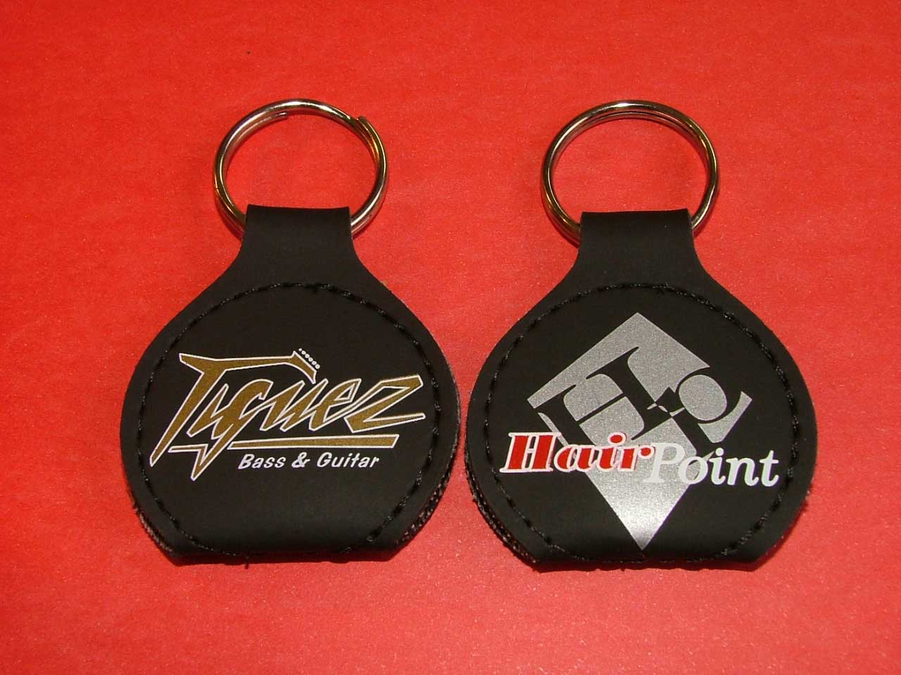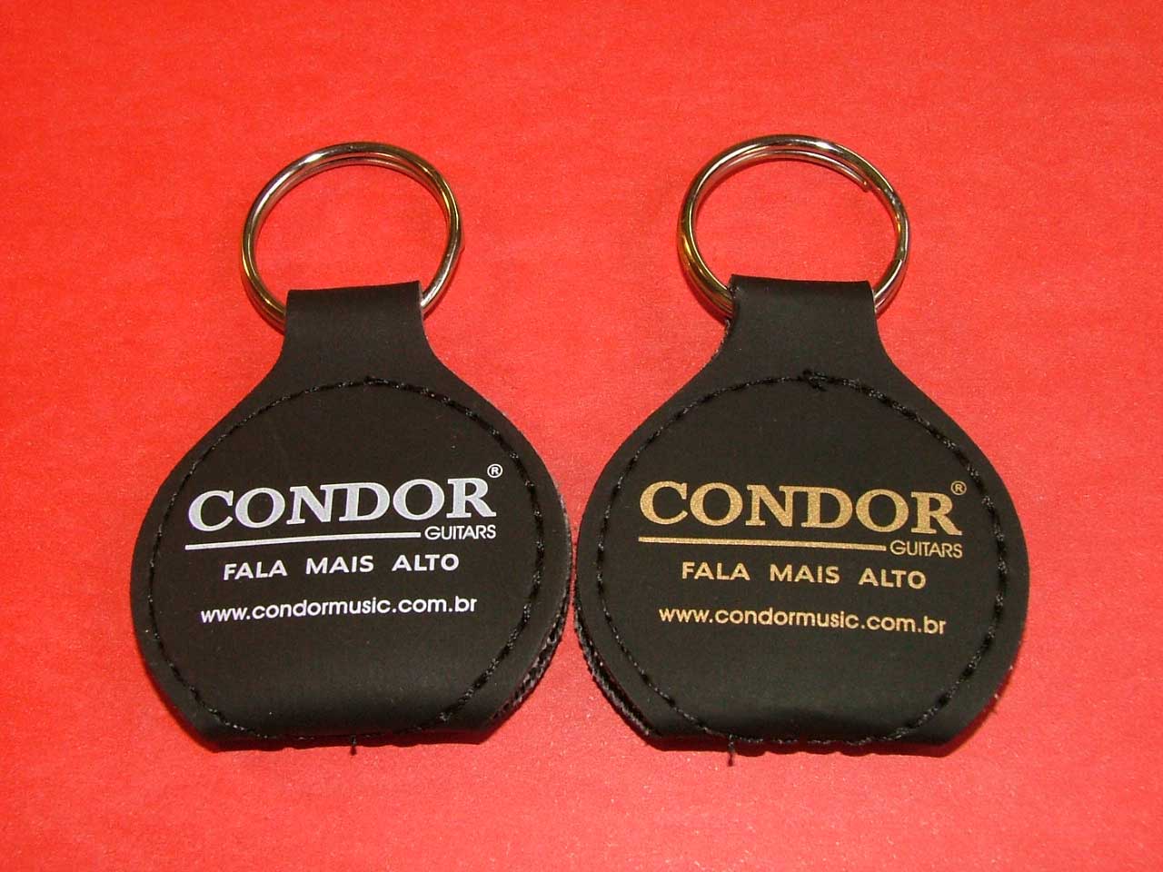 O chaveiro porta-palhetas é confeccionado em couro sintético nas cores preto, tabaco e vermelho. Pedido mínimo: 100 unidades